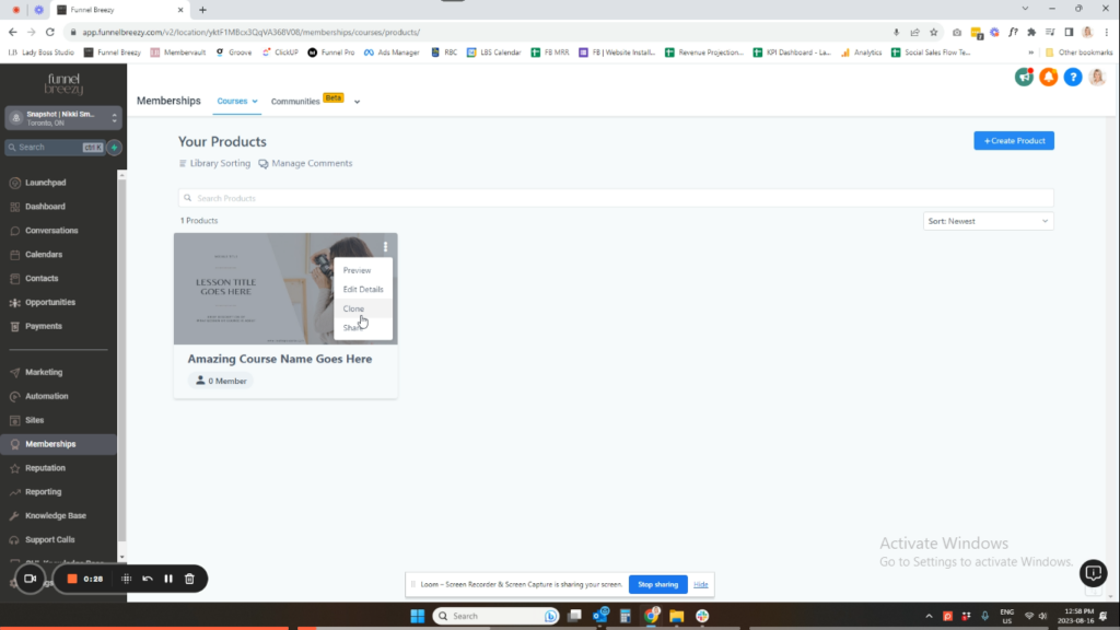 - Edit the Default Course: This course contains basic content. Click the three dots (…) and select “Clone” to create a copy you can customize.
